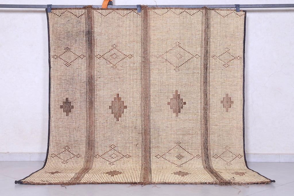 The Sahara desert in North Africa has been home to the nomadic Tuareg people for over 1,000 years. The origin of their name, “Blue People”, is thought to be due to the indigo dye that used to color their garments. They are known for their beautiful handcrafted products, among which their woven mats are the most prized. Tuareg women have been hand weaving mats and carpets for hundreds of years using palm fronds, grasses, and camel or goat hair as artificial fibers of natural materials that they can get in the desert. The traditional Northern African mats are used as floor covering, roofing, and seating in the Tuareg traditional tents and houses. It may take them weeks, or even months to make one large mat or carpet. Traditional mats often contain geometric shapes or symbolic animals like camels, gazelles, and areantiti, which is another symbol for camel, as well as Tuareg calligraphy. Northern African mats are attributed to Tuareg based on the location where they were obtained, and the patterns they display as the designs vary among different tribes and regions. To make a mat, artisans harvest palm fronds, reeds, and grass for fibers and spin them into thread. The thread is then woven into a mat by hand on a vertical loom. Tuareg mats remain significant symbols of nomadic culture and a fundamental part of tribal life As the Tuareg become more sedentary, the making of mats has become recognized as a fine art. Tuareg mats are prized by collectors around the world for their intricate weaving and high quality, and you can join them by adding the artistry of Tuareg mats to your home.