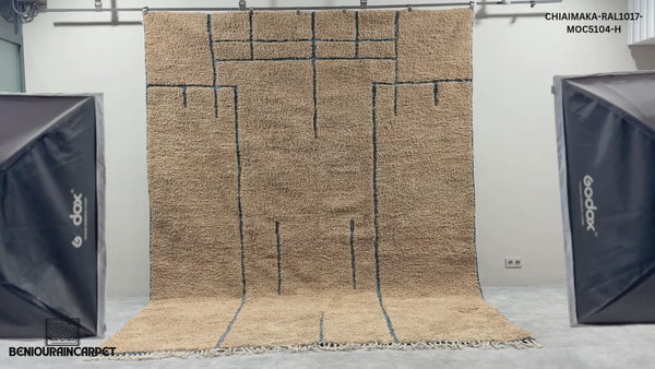This elegant handmade Moroccan rug combines the warmth of natural beige wool with subtle blue linear accents for a modern, minimalist touch. Crafted from 100% genuine Moroccan wool, it brings a cozy yet sophisticated aesthetic to your space — perfect for both contemporary and traditional interiors.