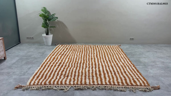 Add a pop of color and authentic Moroccan artistry to your home with this handmade rug featuring dynamic orange and white linear patterns. Woven by skilled Berber artisans using 100% natural wool, this rug combines vibrant hues with traditional techniques, creating a striking piece that energizes any room.